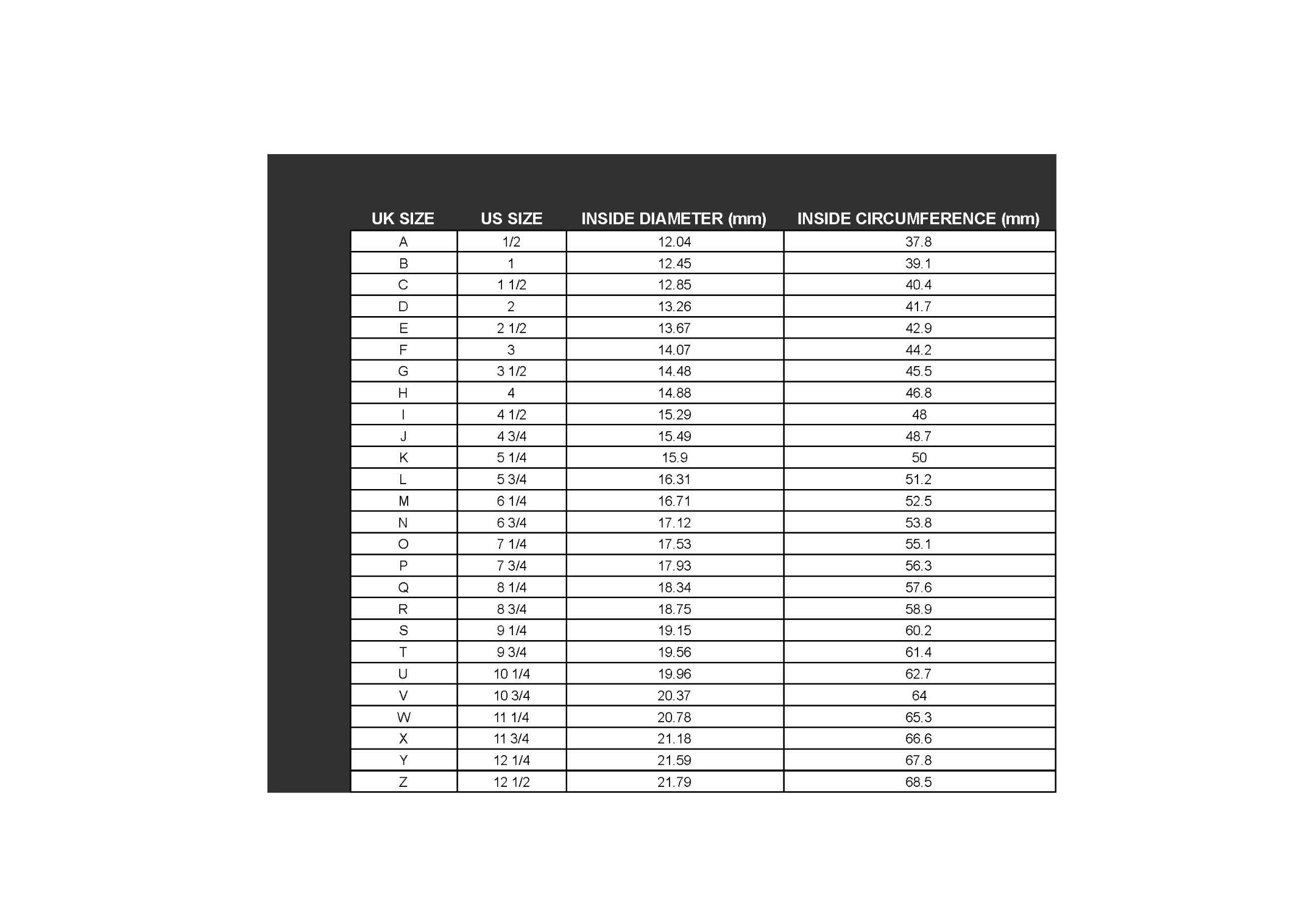 2.  Use the conversion chart below to convert the INSIDE diameter mm measurement to UK ring size using a ruler to measure the INSIDE diameter.
