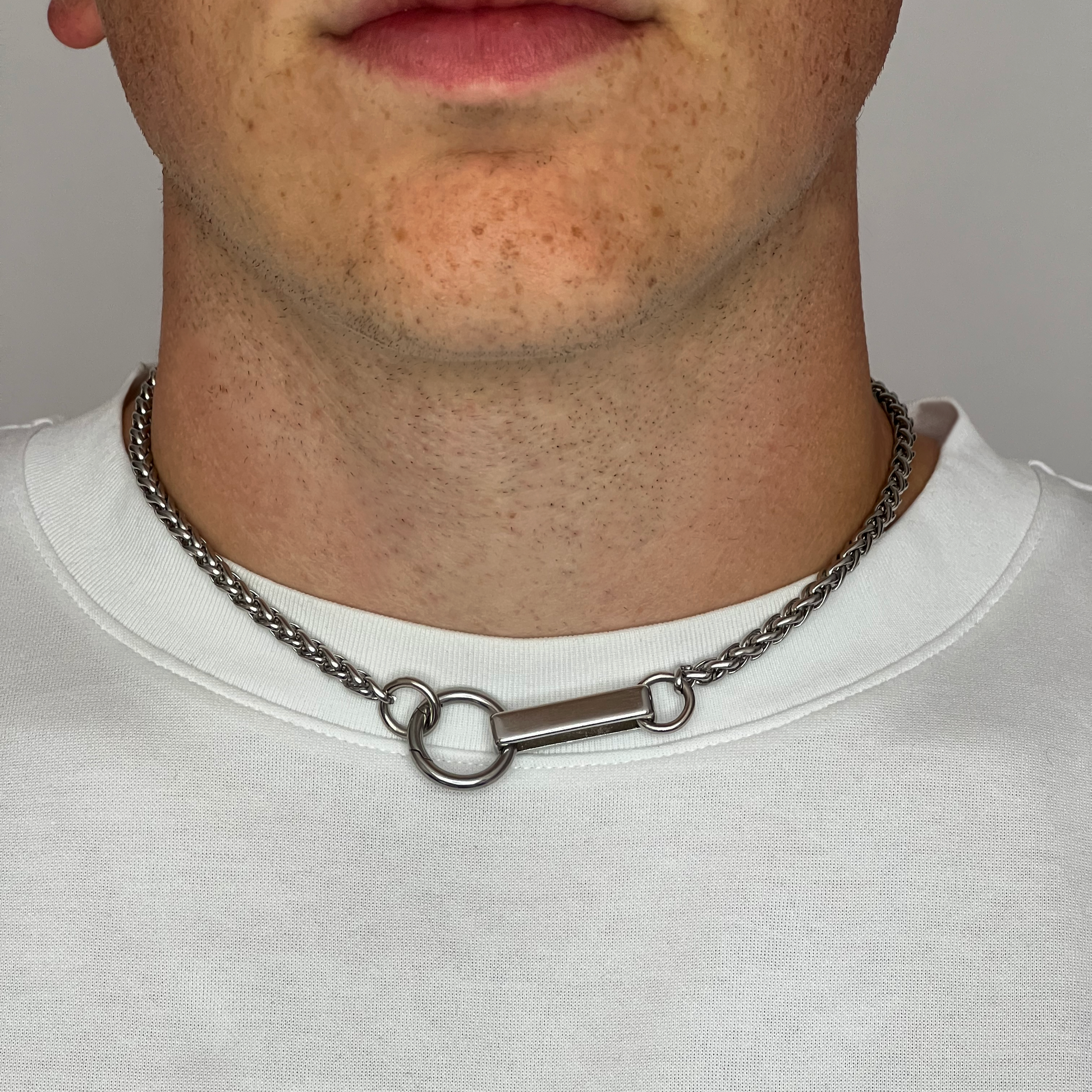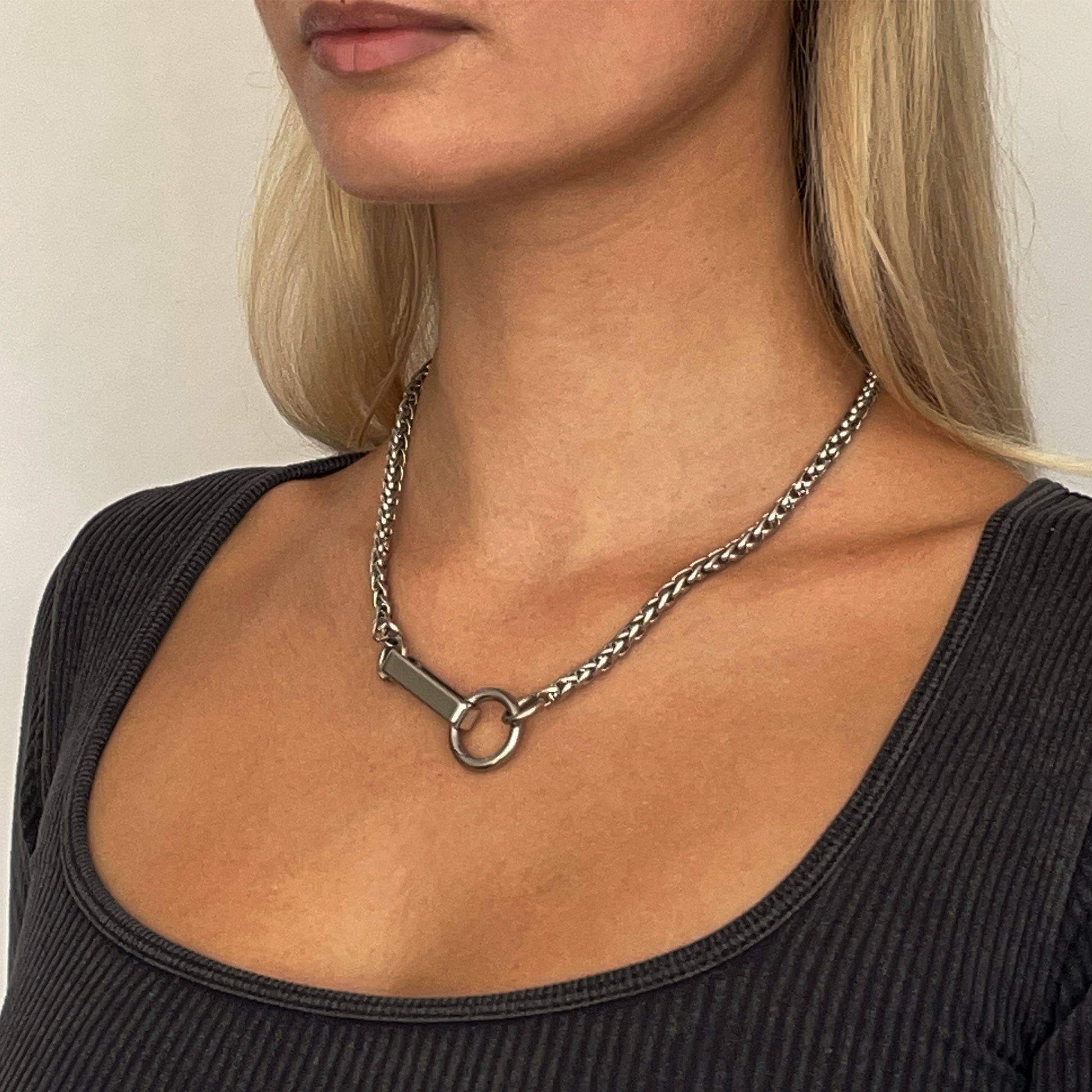 Our signature hinged ring fastens onto the stainless steel bar